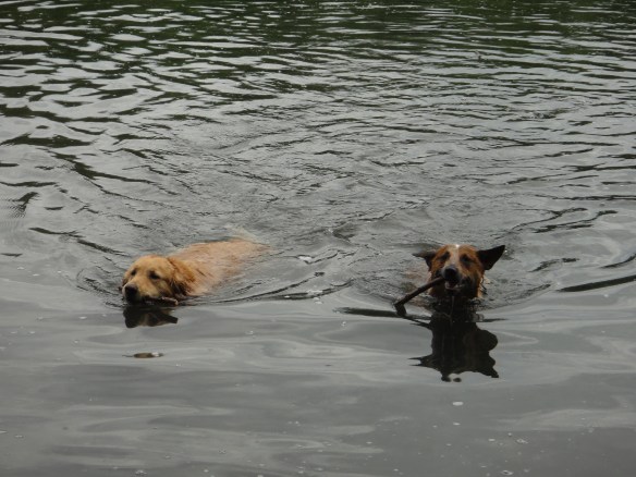 Phoebe and Pongo deciding who was going to bring the stick back to shore.